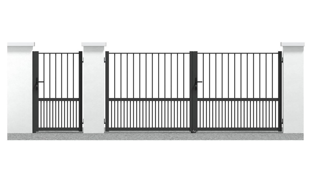 Disponible en portail alu battant (vantaux inégaux en option), ou portail alu coulissant (sur rail ou autoporté), il est composé de montants 70x54x3 mm avec bouchons de finition aluminium, et de traverses basse et médiane 60x40x3 mm. Le remplissage est assuré par des barreaux ajourés de diamètre 20 mm.